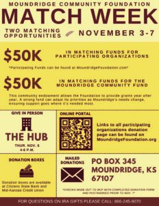 Checks must be payable to MCF with “Moundridge Match Week” in the memo line. To qualify, donations must be postmarked by Nov. 7.